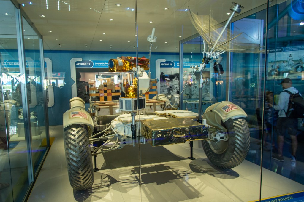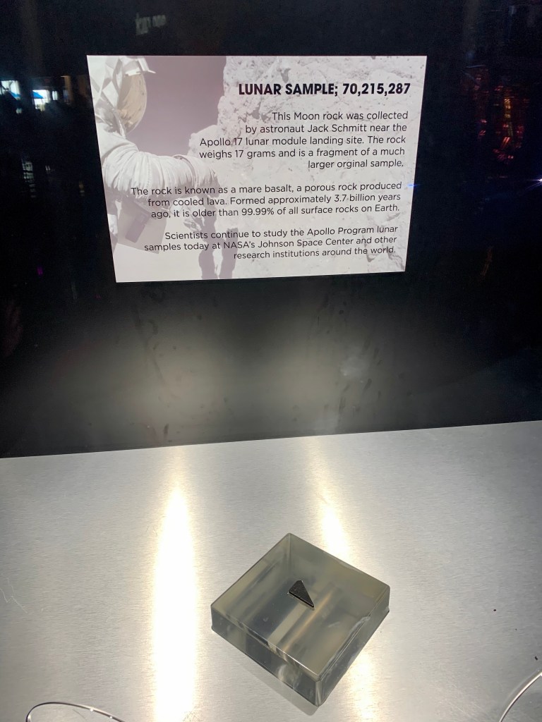 Nel museo c’è anche un frammento di roccia lunare che i visitatori possono toccare. Altri oggetti esposti includono una replica del Lunar Roving Vehicle, una varietà di tute spaziali tra cui la tuta extraveicolare Apollo 14 di Alan Shepard ed un pezzo del modulo lunare dell’Apollo 13.
