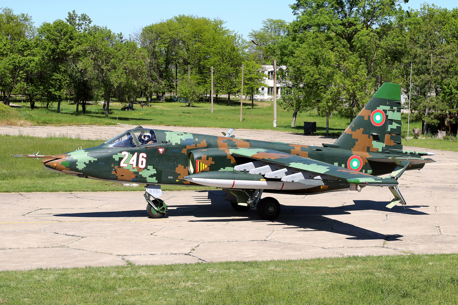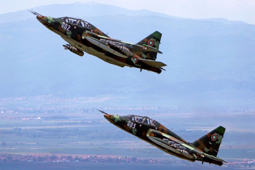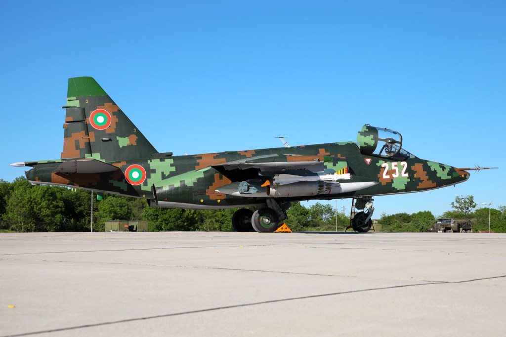 Dopo la fine della guerra fredda l’aviazione della Bulgaria vantava 226 aerei ma da quel momento in poi ha dovuto rivoluzionare il suo assetto e il suo parco macchine e si è vista costretta suo malgrado alla messa a terra di buona parte della sua flotta di aerei. Anche diverse basi aeree hanno visto la loro fine definitiva in quegli anni. Nel 1993 i reggimenti aerei di Bezmer e Sadovo furono sperimentalmente trasformati in “basi aeree” con la fusione dei reggimenti aerei con i battaglioni di aviazione tecnica e di servizio. Intorno al 1995-1996 tutti i reggimenti aerei furono trasformati in basi aeree (equivalenti di brigata) e furono formati due comandi principali: Air Defense Command (Командване за противовъздушна отбрана) e il Tactical Aviation Command (Командване за противовъздушна отбрана). Dall’inizio degli anni 2000, la Bulgaria ha cercato attivamente di ristrutturare le sue forze armate nel suo insieme e molta attenzione è stata posta nel mantenere operativi i vecchi aerei russi ancora rimasti in linea tra cui i Sukhoi di Bezmer. Il Sukhoi Su-25 , nome in codice NATO Frogfoot, è un aereo a reazione bimotore monoposto sviluppato in Unione Sovietica da Sukhoi. È stato progettato per fornire supporto aereo ravvicinato per le forze di terra sovietiche. Il primo prototipo fece il suo primo volo il 22 febbraio 1975. Dopo i test, l’aereo entrò in produzione in serie nel 1978 a Tbilisi, nella Repubblica socialista sovietica georgiana . Fino a due anni fa si stavano spegnendo le speranze di vedere ancora questo aereo volare ma invece la determinazione del Ministro della Difesa ha permesso di far tornare operativo un reparto a pieni ritmi con ben otto macchine pienamente revisionate e potenziate.