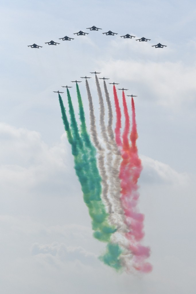 But let’s go back to the 40 Years event; after the official ceremony the expected flight schedule followed, opened by some group and individual passes of the “Legend” formation, made up of propeller and jet trainers, old and new, who have made the history of our Armed Force. Then, the salient moment of the programme, with the overflight of a “patrol” of 9 Tornados that preceded our Frecce Tricolori. However, 10 Tornados flew altogether, for the occasion also a special colour Tornado was set up to celebrate the event. The aircraft (an ECR one with code 6-66) featured all the colour schemes that have accompanied it throughout its operational life: a white front (with tri-national roundel on the right side) to remember the livery of the first prototypes; followed by the classic grey-green NATO camouflage; behind the wing, a part painted in the “desert” colour used during the Gulf War in 1991; and on the tail, the standard grey camouflage currently used, embellished with the event logo. On the sub-wing fuel tank, the insignia of the Squadrons using the Tornado, the aforementioned 102°, 154° and 155°, with the addition of the 156° Squadron’s “Lynxes”.